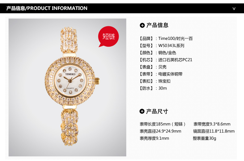 时光一百(TIME100)女表小表盘简约防水女士腕表套装女手链手表七夕礼物送女友W50888L钢色