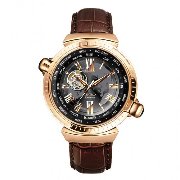 先机系列 世界时区镂空全自动真皮机械表男表 香港钟表设计大赛获奖作品,巴塞尔参展手表