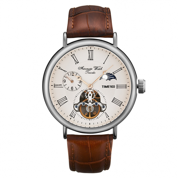 TIME100凌空系列时尚全景镂空机械表增强夜光陀轮男士复古腕表W60165G