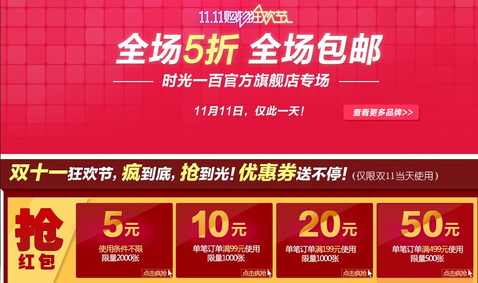 双十一马上就要开始了,各类商家无论是传统实体店还是空中电商都已蓄势待发,作为专业手表电商TIME100今年是第二次迎战双11,为了让更多网民享受到手表购物的快感,此次双11大促的让力度将达到本年度最高点。